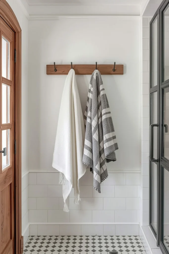 Designers use peg rails to create a relaxed, lived-in feel while keeping towels neatly arranged. This style works especially well in farmhouse, coastal, or Scandinavian-inspired bathrooms.