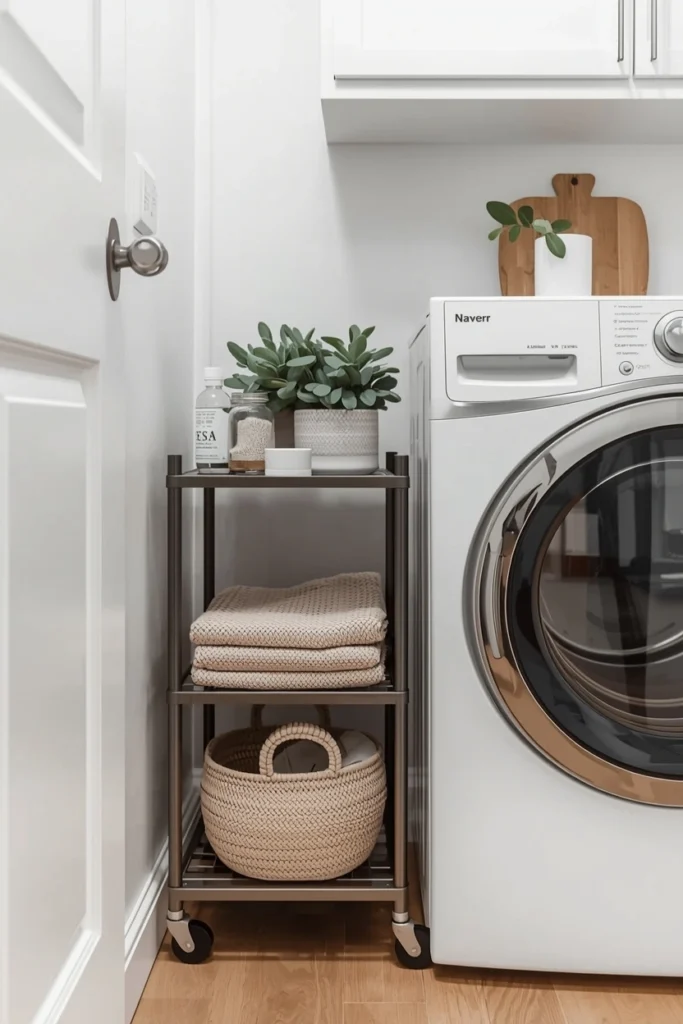 A slim rolling cart fits easily between appliances and provides extra storage. Use it for detergents, cleaning tools, or folded clothes. It keeps essentials accessible without cluttering counters.