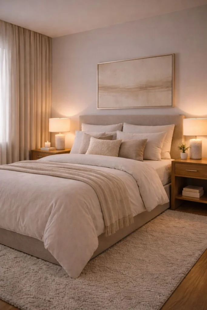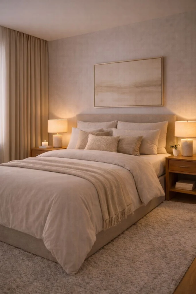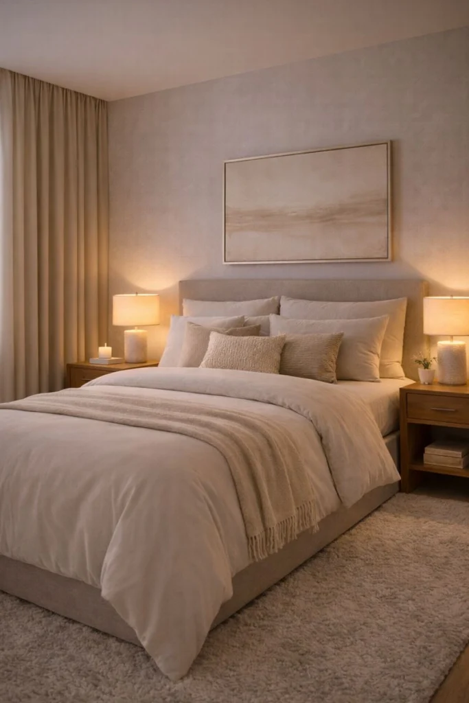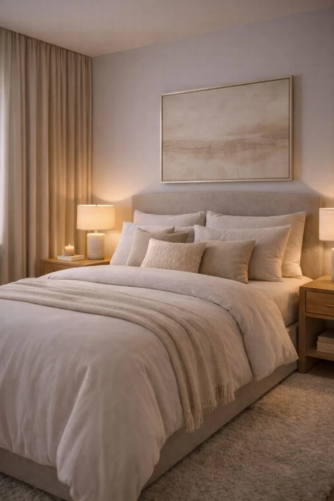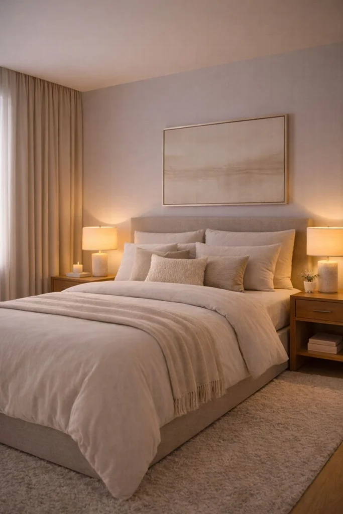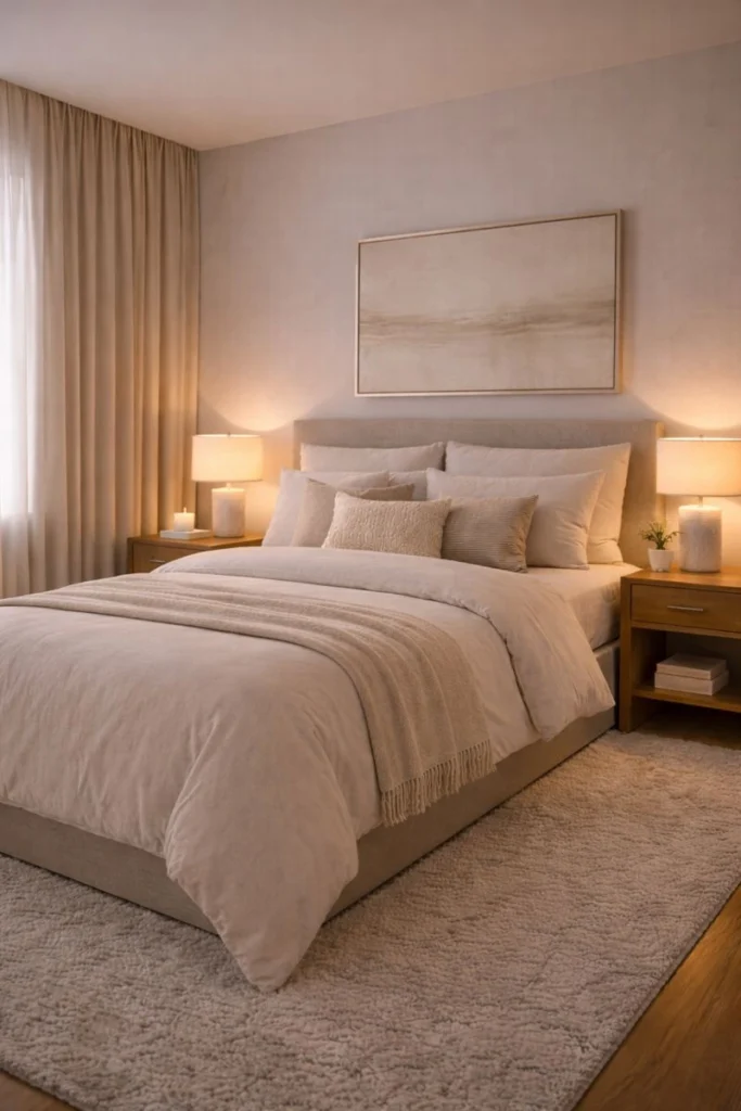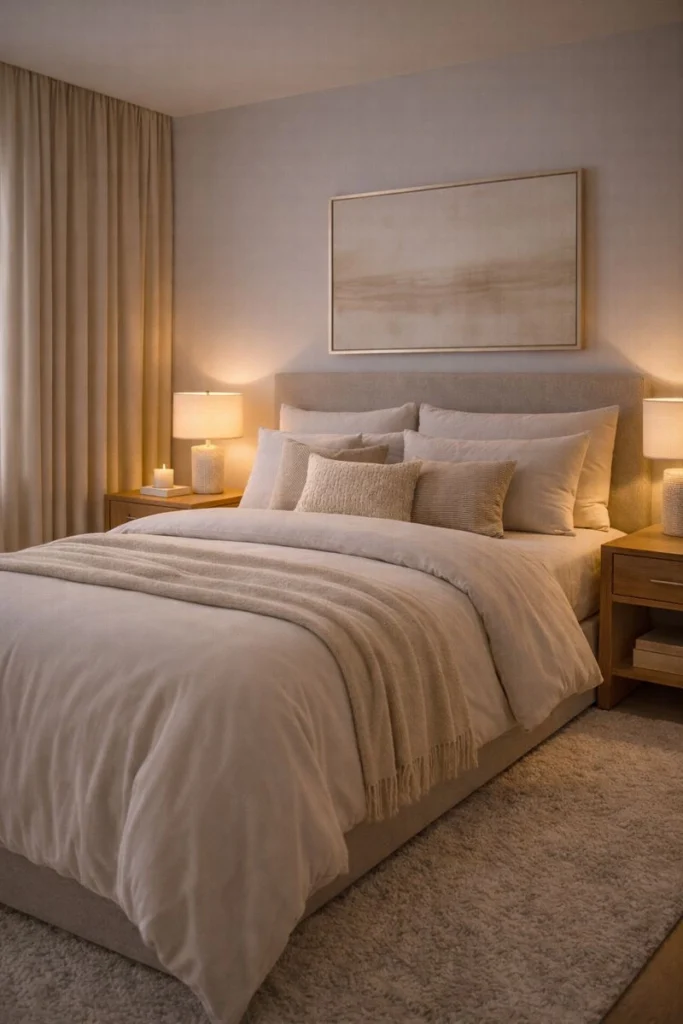 Cozy luxury bedroom ideas rely on restraint. A single piece of artwork above the bed or a curated vignette on a dresser adds personality while maintaining serenity. This approach allows the space to feel intentional and calm, reinforcing the hotel-inspired aesthetic.