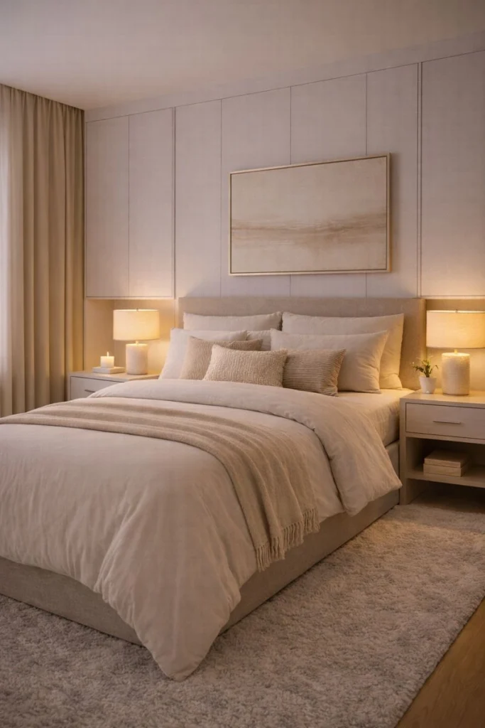 A tall or wide upholstered headboard also creates a sense of structure and balance. Neutral tones keep the look timeless, while subtle detailing such as channel tufting or curved edges adds sophistication. This design choice enhances both comfort and style, offering a polished hotel feel without unnecessary ornamentation.