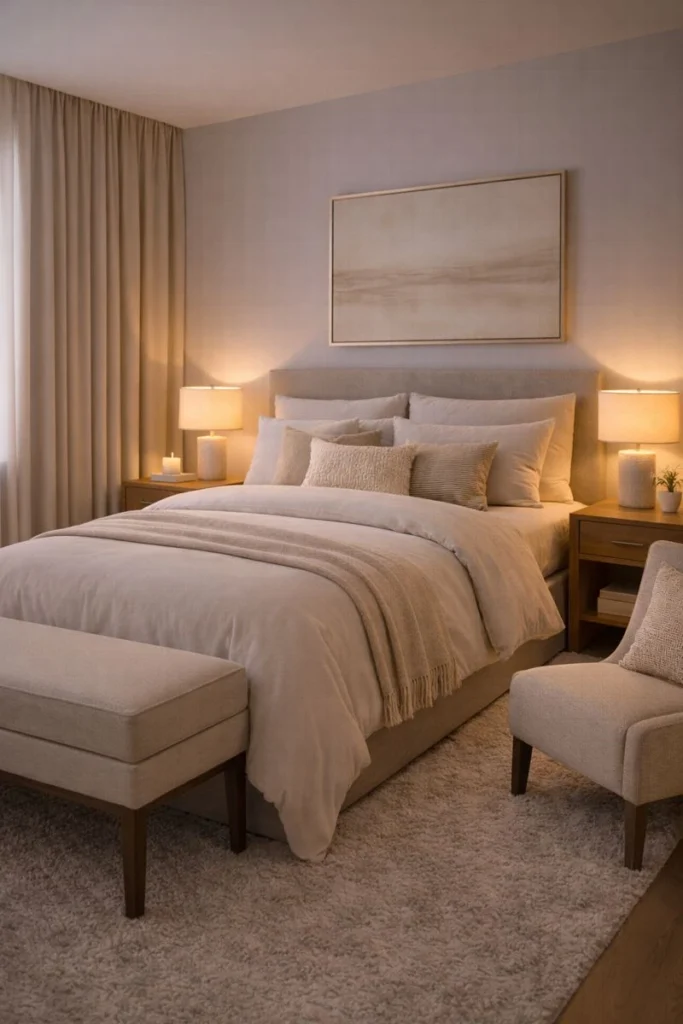 In cozy luxury bedroom ideas, accent seating is understated yet refined. Neutral upholstery, curved silhouettes, and plush cushions maintain softness without crowding the space. This subtle addition reinforces the feeling of a thoughtfully designed hotel suite.