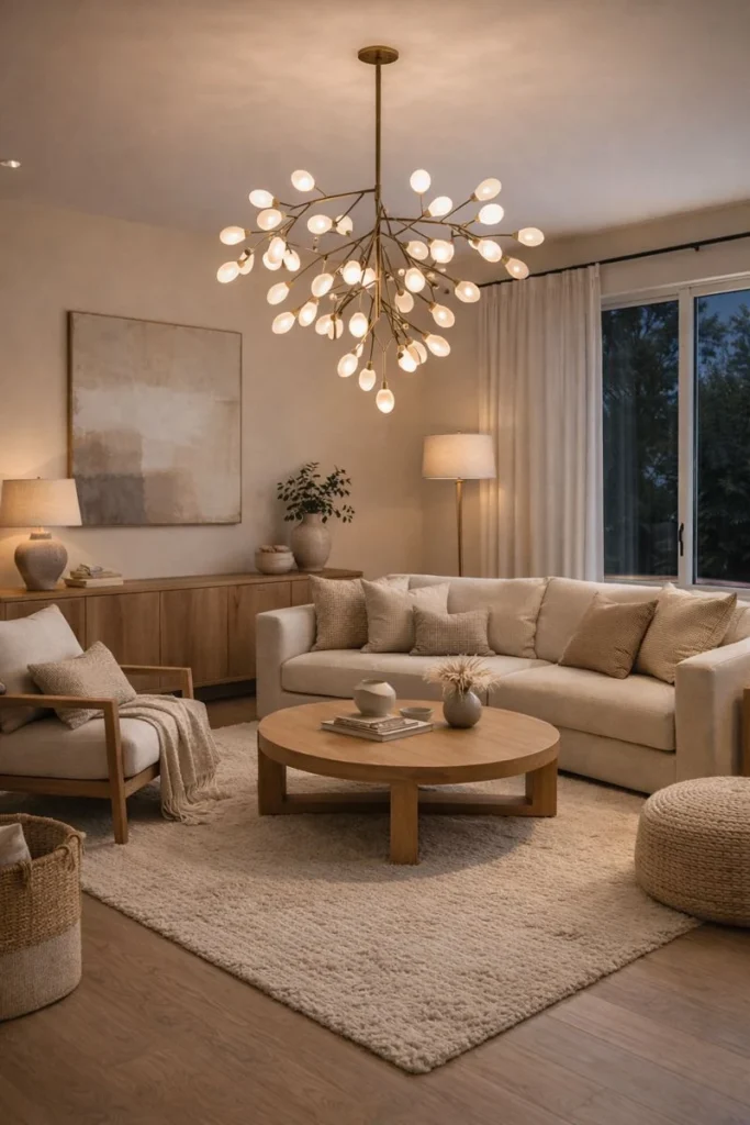 Rather than relying solely on overhead lighting, designers incorporate layered lighting plans that include ambient, task, and accent sources. A bold light fixture anchors the space and adds personality without requiring additional décor. This approach enhances both mood and functionality, allowing the living room to transition seamlessly from day to night. Statement lighting reflects a shift toward intentional design choices that combine beauty and practicality.